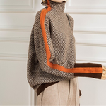 Say goodbye to itchy fabrics and shapeless sweaters. The Victoria Turtleneck is crafted from a premium, soft-touch knit that feels smooth, lightweight, and cozy against your skin. The bold herringbone pattern with warm orange accents brings a touch of modern sophistication, while the relaxed yet flattering fit makes it effortlessly versatile from day to night.